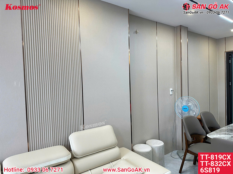 Lam sóng 6S819 thường kết hợp với tấm ốp than tre TT-819CX cùng vân vải chống xước vàng kem ánh kim, hoặc với các tấm ốp than tre vân gỗ tông vàng nhờ đặc tính màu sắc và kết cấu bề mặt của nó.