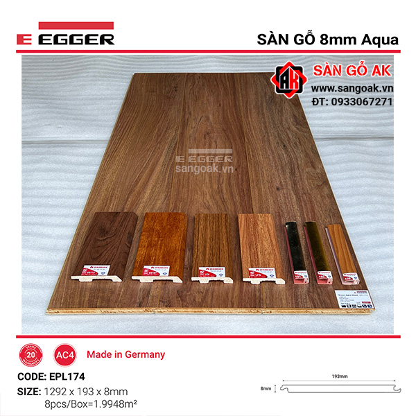 Sàn gỗ công nghiệp Egger Aqua 8mm EPL174 là dòng sản phẩm cao cấp được nhập khẩu trực tiếp từ Đức. Sàn gỗ này có khả năng chịu ngập nước lên đến 1000 giờ và có thể khóa nước bề mặt 72 giờ. Bề mặt sàn gỗ có khả năng kháng khuẩn, chống trầy xước, chống trơn trượt nên rất an toàn cho người sử dụng. Ngoài ra sàn còn được bảo hành chất lượng lên đến 10 năm và chống mối mọt trọn đời nên sàn có độ bền bỉ cao, tuổi thọ lâu dài.