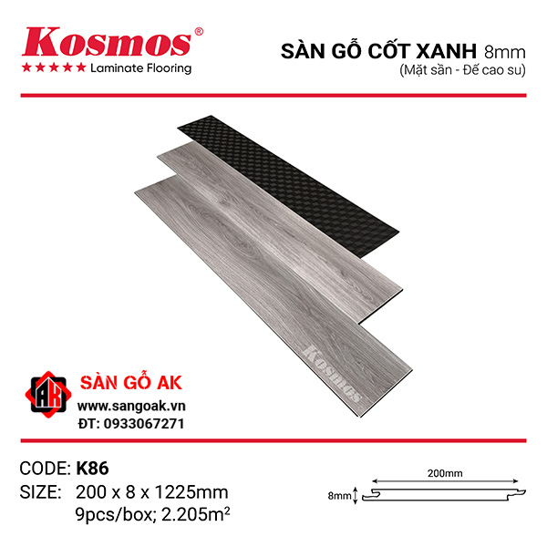 Sàn gỗ cốt xanh Kosmos 8mm K86 là dòng sản phẩm mới được Kosmos cho ra mắt vào đầu năm 2024, cốt gỗ với mật độ cao lên đến 870kg/m3 giúp sàn gỗ chống ẩm vượt trội. Ngoài ra dòng sàn này cũng được trang bị lớp đế cao su ở mặt đáy dày khoảng 1.5mm tiện lợi cho quá trình thi công. Sàn gỗ công nghiệp Kosmos còn sở hữu bề mặt sần vân gỗ có tính thẩm mỹ cao, hạn chế trơn trượt, an toàn cho người dùng, đa dạng mẫu mã.
