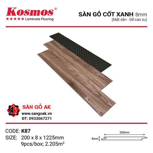 Sàn gỗ cốt xanh Kosmos 8mm K87 là dòng sản phẩm mới được Kosmos cho ra mắt vào đầu năm 2024, cốt gỗ với mật độ cao lên đến 870kg/m3 giúp sàn gỗ chống ẩm vượt trội. Ngoài ra dòng sàn này cũng được trang bị lớp đế cao su ở mặt đáy dày khoảng 1.5mm tiện lợi cho quá trình thi công. Sàn gỗ công nghiệp Kosmos còn sở hữu bề mặt sần vân gỗ có tính thẩm mỹ cao, hạn chế trơn trượt, an toàn cho người dùng, đa dạng mẫu mã.