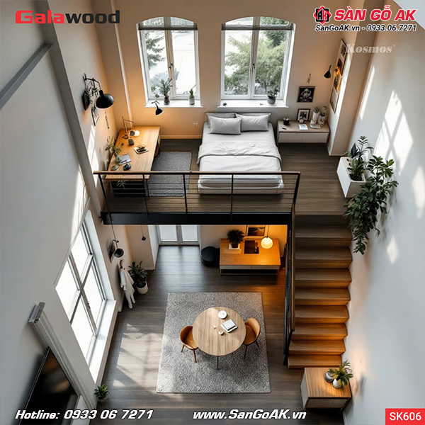 Trong thế giới thiết kế nội thất đương đại, việc lựa chọn vật liệu hoàn thiện phù hợp không chỉ ảnh hưởng đến tính thẩm mỹ mà còn đảm bảo độ bền và sự thoải mái cho không gian sống. Một trong những sản phẩm nổi bật trong dòng sàn nhựa hiện nay chính là Sàn nhựa chịu lực Galawood SK606. Với vẻ đẹp cổ điển và sang trọng, sàn SK606 đã khẳng định được vị thế của mình trong các công trình kiến trúc hiện đại, đặc biệt là khi được ứng dụng cho các không gian gác lửng.