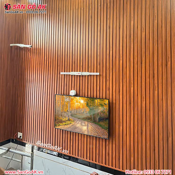 Công trình ốp vách tivi bằng lam 3 sóng vân gỗ đỏ cam