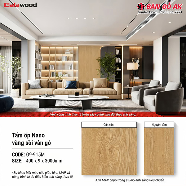 Hãy để tấm ốp Nano Galawood G9-915M vân gỗ sồi vàng biến không gian sống của bạn trở nên nổi bật và ấm cúng hơn. Lựa chọn sản phẩm chất lượng chính là lựa chọn cho tương lai bền vững của ngôi nhà bạn!